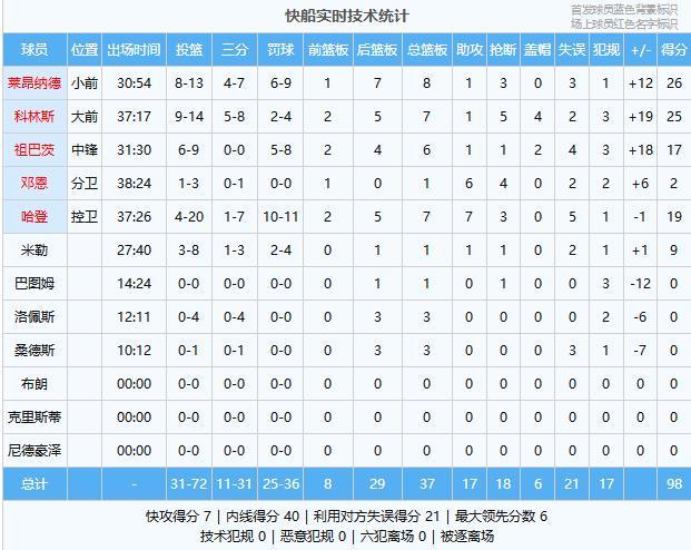萊昂納德26分8板1助3斷、科林斯25分7板1助5斷4帽、哈登19分7板7助3斷、祖巴茨17分6板1助2帽、米勒9分1板1助、鄧恩2分1板6助4斷