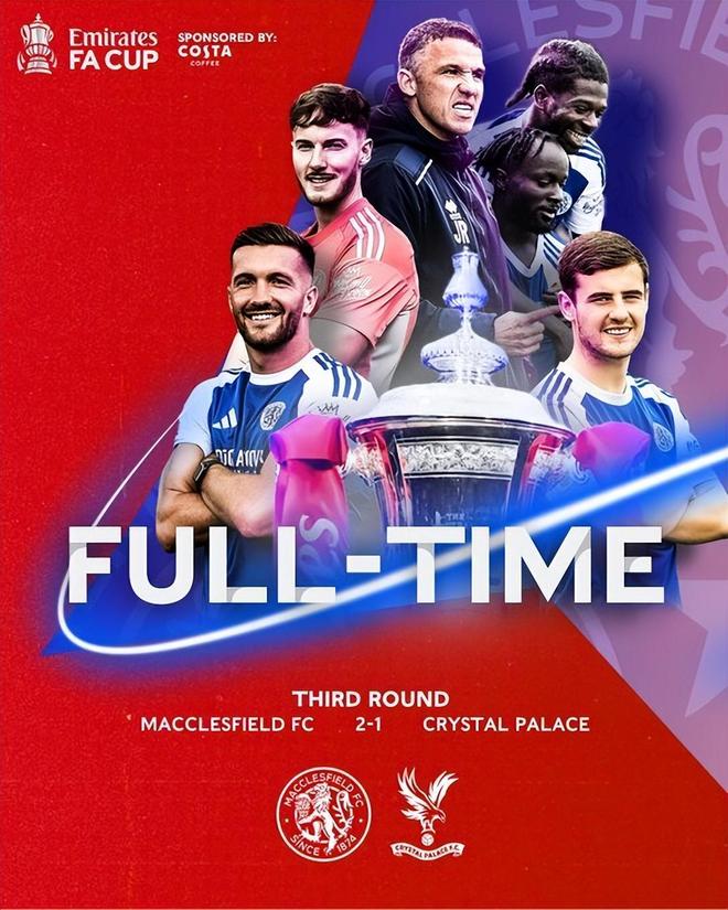 當(dāng)莫斯羅斯球場(chǎng)的終場(chǎng)哨聲劃破夜空,5000個(gè)座位的看臺(tái)上爆發(fā)出震耳欲聾的歡呼,足以穿透英格蘭西北部的寒冬。麥克斯菲爾德球員們相擁而泣,他們胸前的隊(duì)徽在燈光下閃耀,背后是“絲人”昵稱所承載的百年足球底蘊(yùn)與重生韌性。2-1,這支征戰(zhàn)英格蘭第六級(jí)別聯(lián)賽的非職業(yè)球隊(duì),擊敗了英超衛(wèi)冕冠軍水晶宮,創(chuàng)造了足總杯自1908-09賽季以來最震撼的冷門——衛(wèi)冕冠軍首次被非職業(yè)球隊(duì)淘汰。這不是一場(chǎng)簡(jiǎn)單的勝利,而是一曲關(guān)于堅(jiān)守、抗?fàn)幣c傳承的贊歌,每一個(gè)音符都鐫刻著麥克斯菲爾德的苦難與榮光。